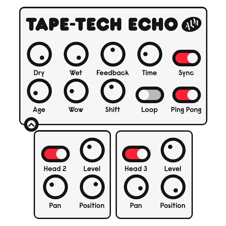 The ‘Digi-PCM Echo’ is an unapologetically digital delay inspired by early digital rack delays. The ‘Tape-Tech Echo’ is an analog tape style delay with a lo-fi pitch shifter bolted on and expanded control over play heads.